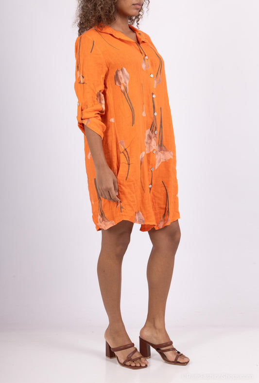 Chemisier à Fleurs Manches Boutonnées 100% Lin
