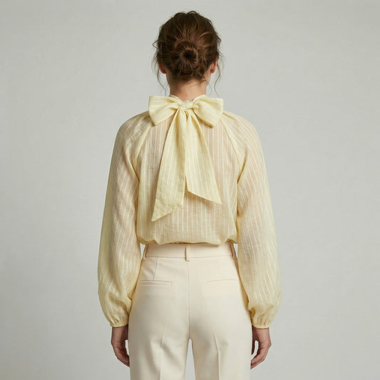 Chemisier Rayé à Volants Col Nœud Arrière Manches Bouffantes Élastique
