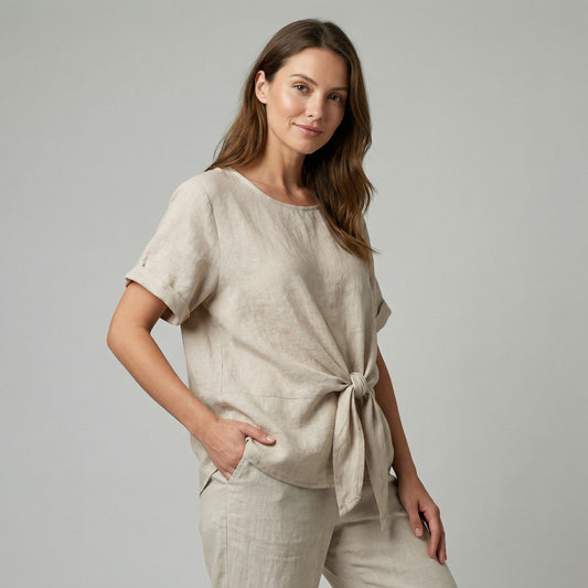 T-Shirt Manche Courte Large Nœud Décoratif 100% Lin
