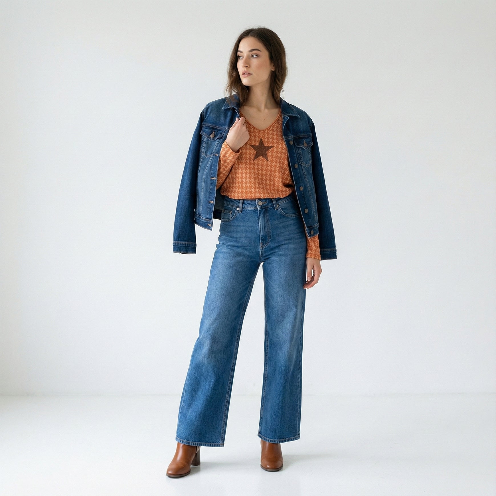 Round Neck T-Shirt with Houndstooth Pattern and Star Print