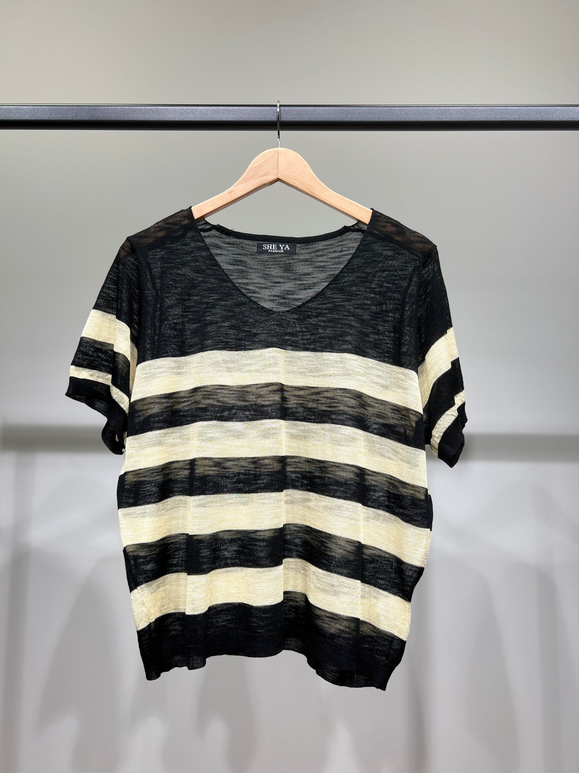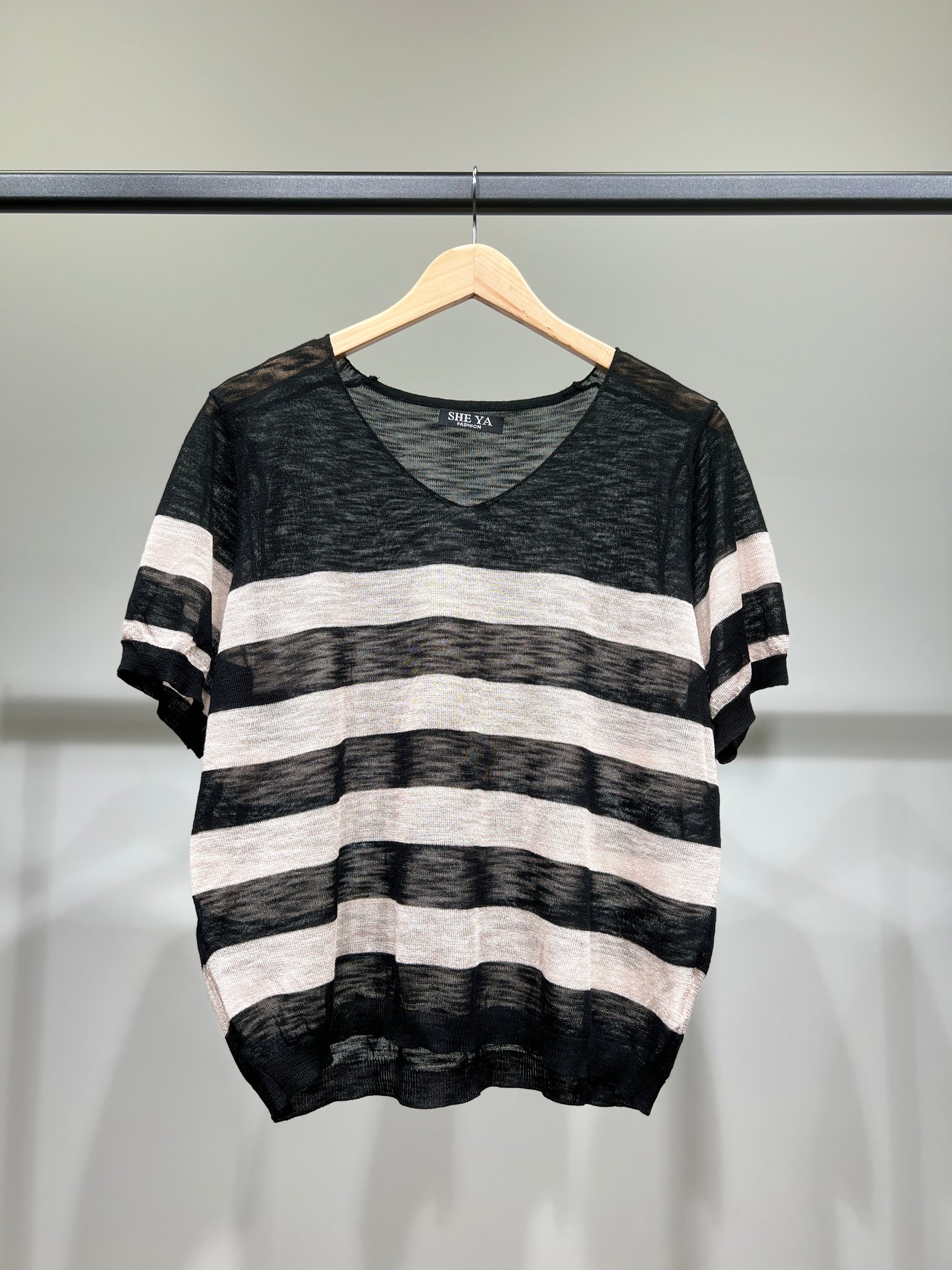 T-Shirt Fin Chiné Motif Marinière Col V à 25% Lin 20% Tencel Taille Unique Convient Aux Tailles 38-44