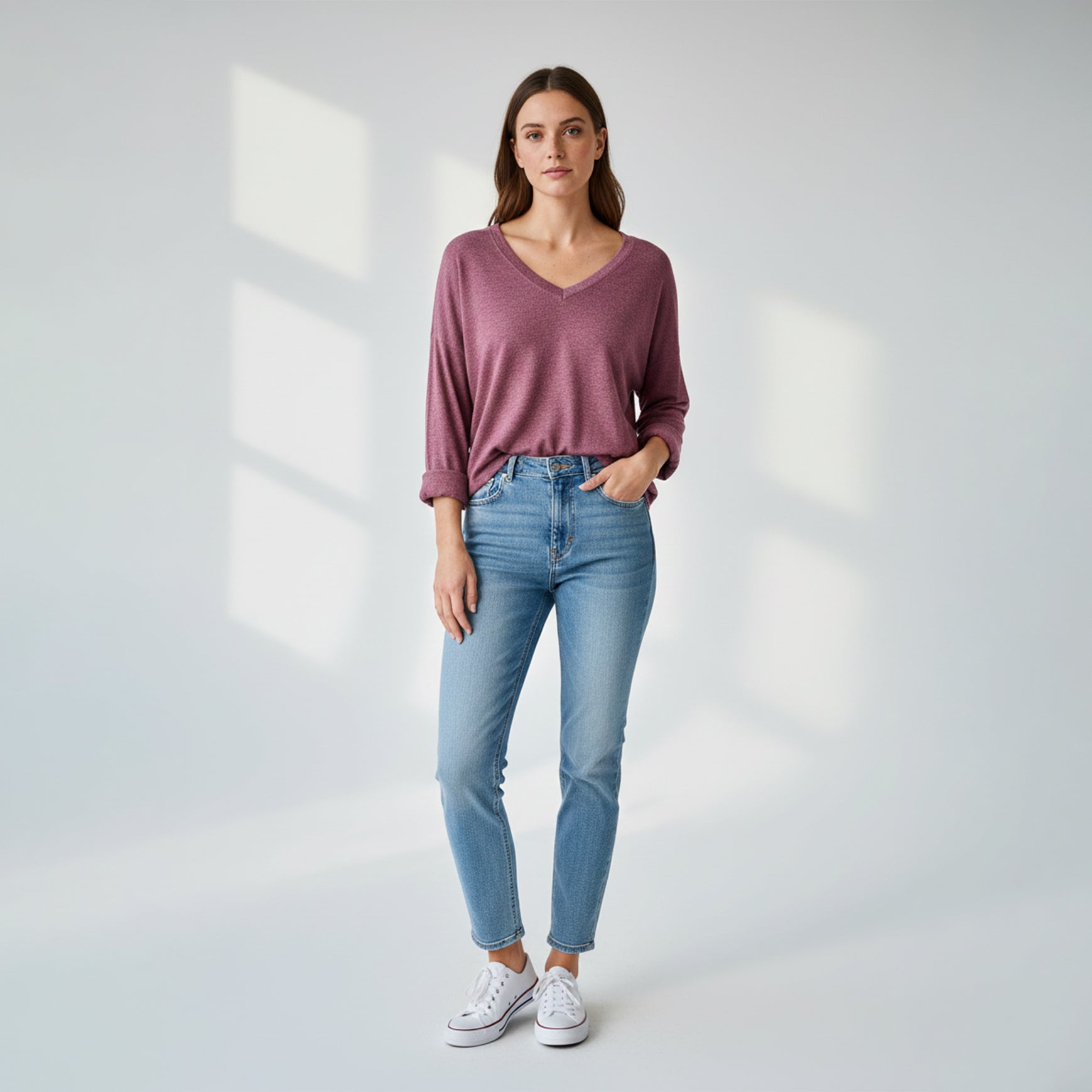 Long Sleeve T-Shirt with V-Neck and Back Opening and Decorative Bow