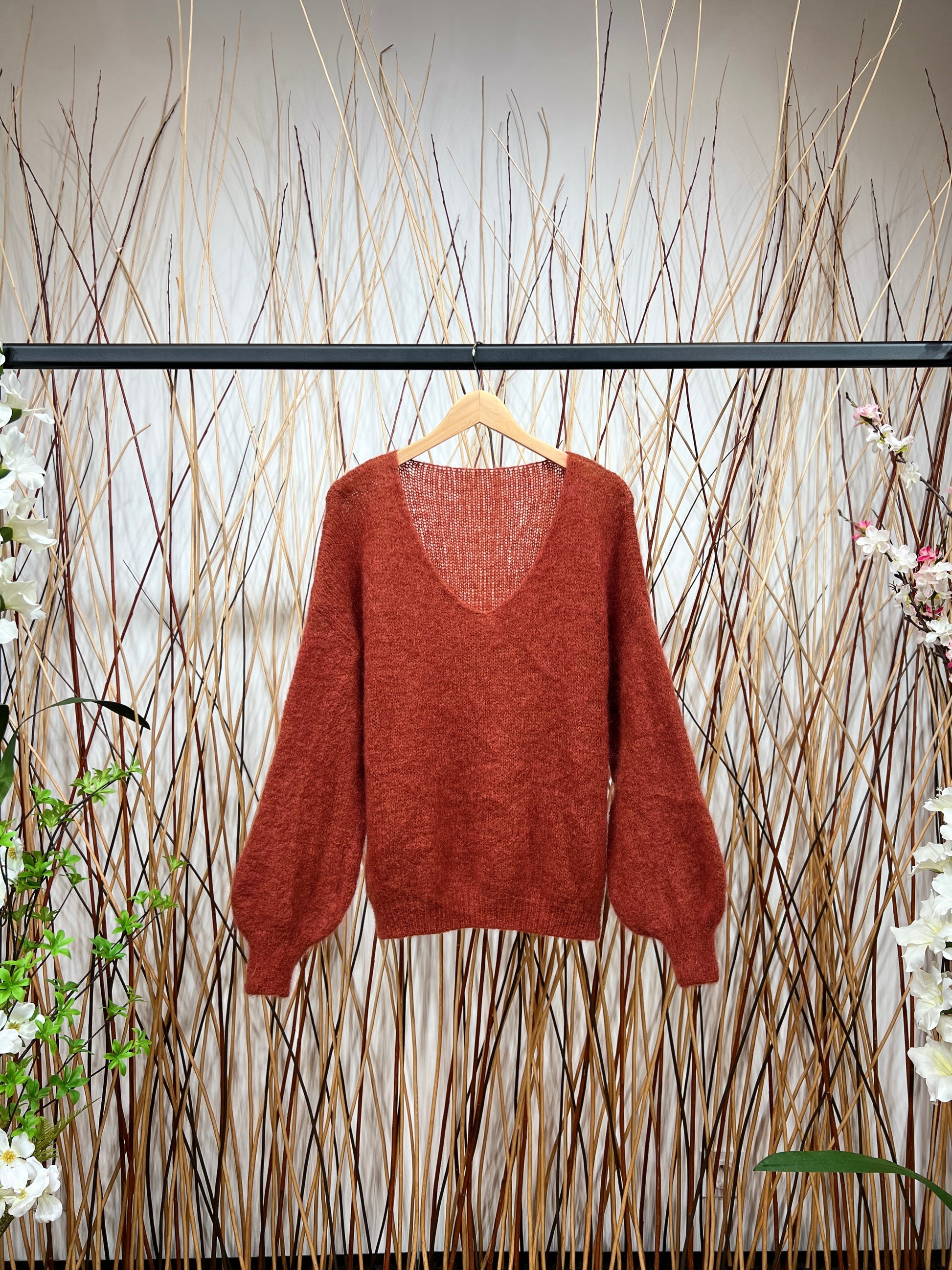 Pull Maille Large Col V Manche Longue Côtelé 80% Kid Mohair
