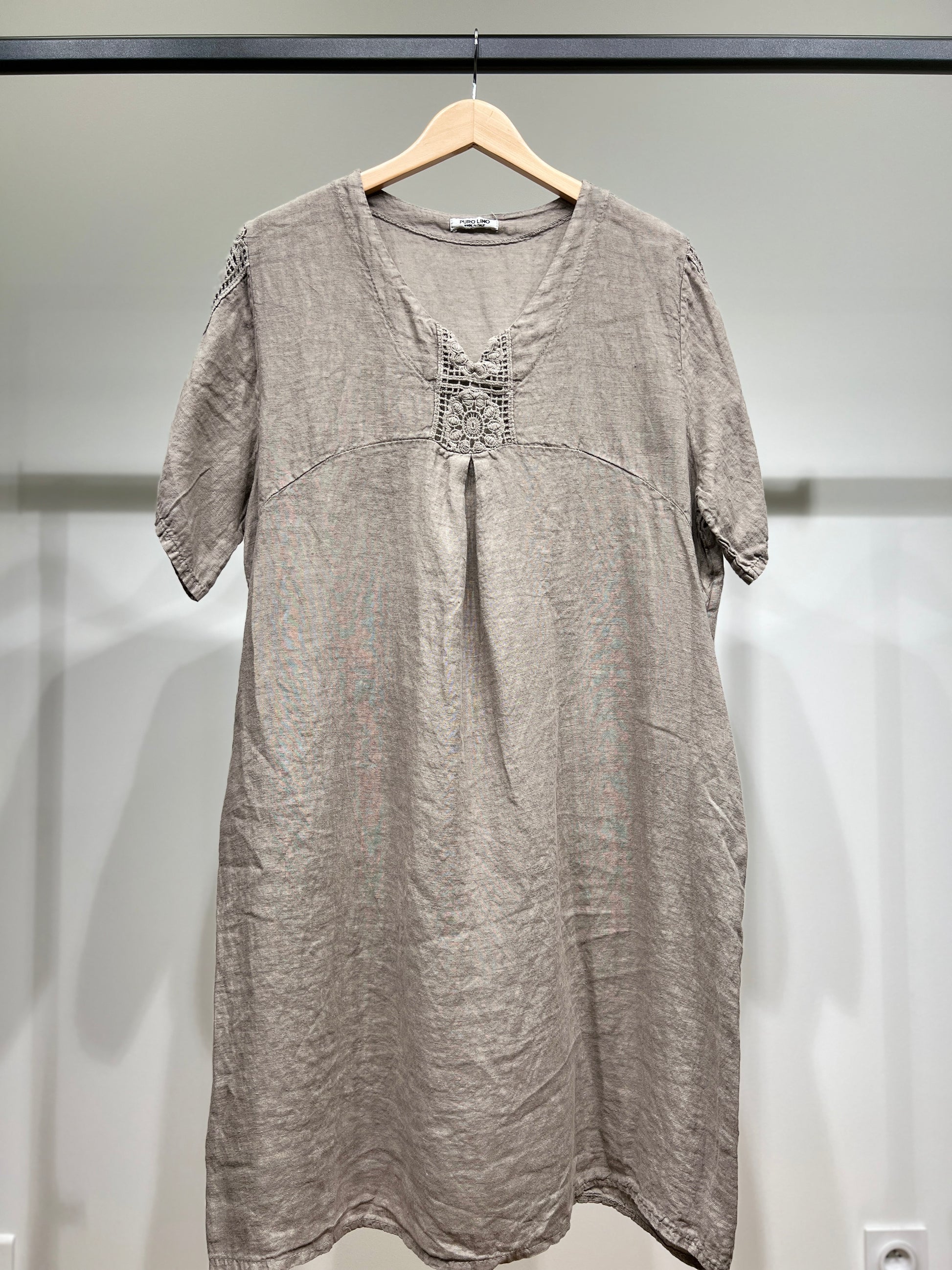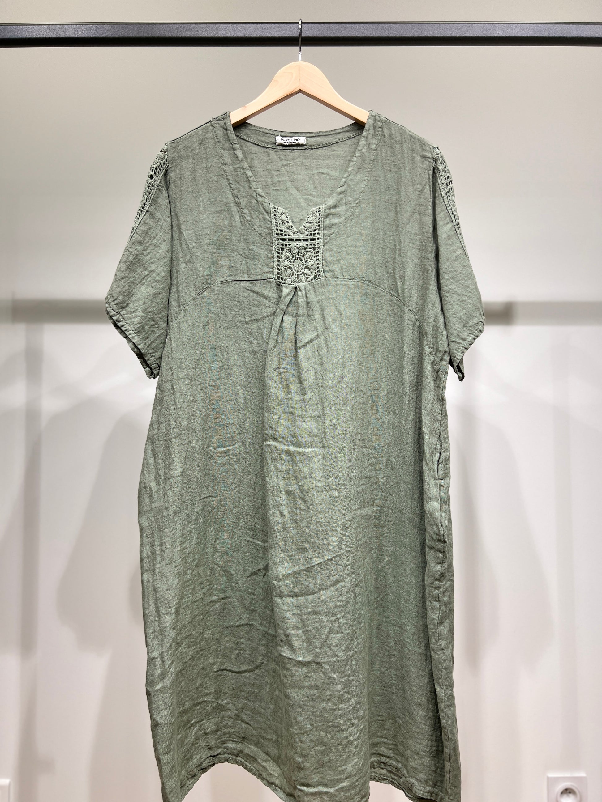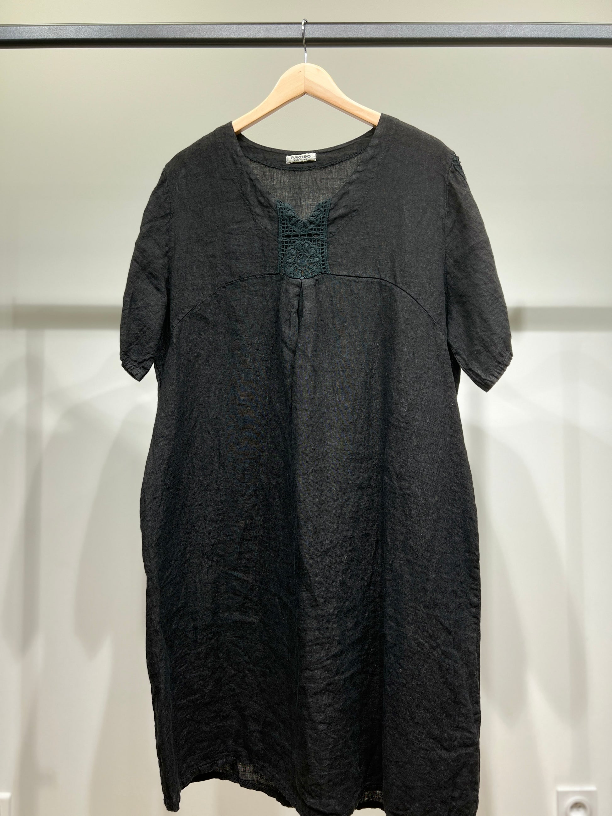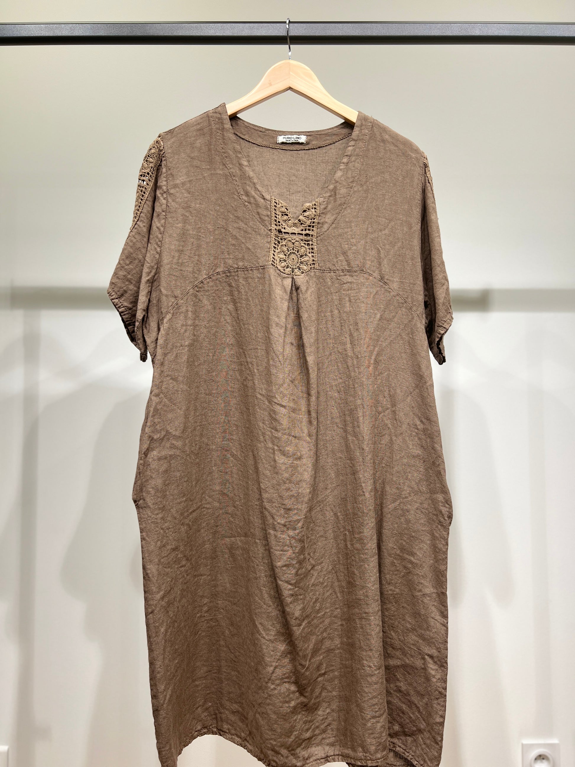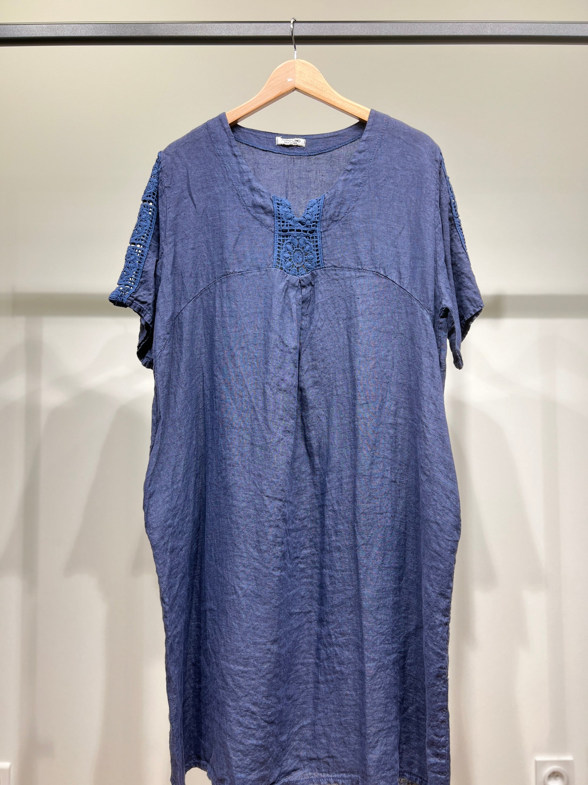 Robe Manche Courte Col V Dentelle Poches 100% Lin Taille Unique Convient Aux Tailles 38-46
