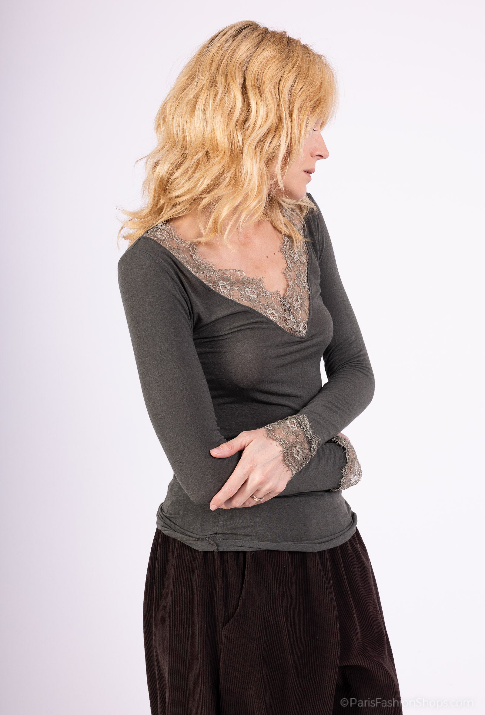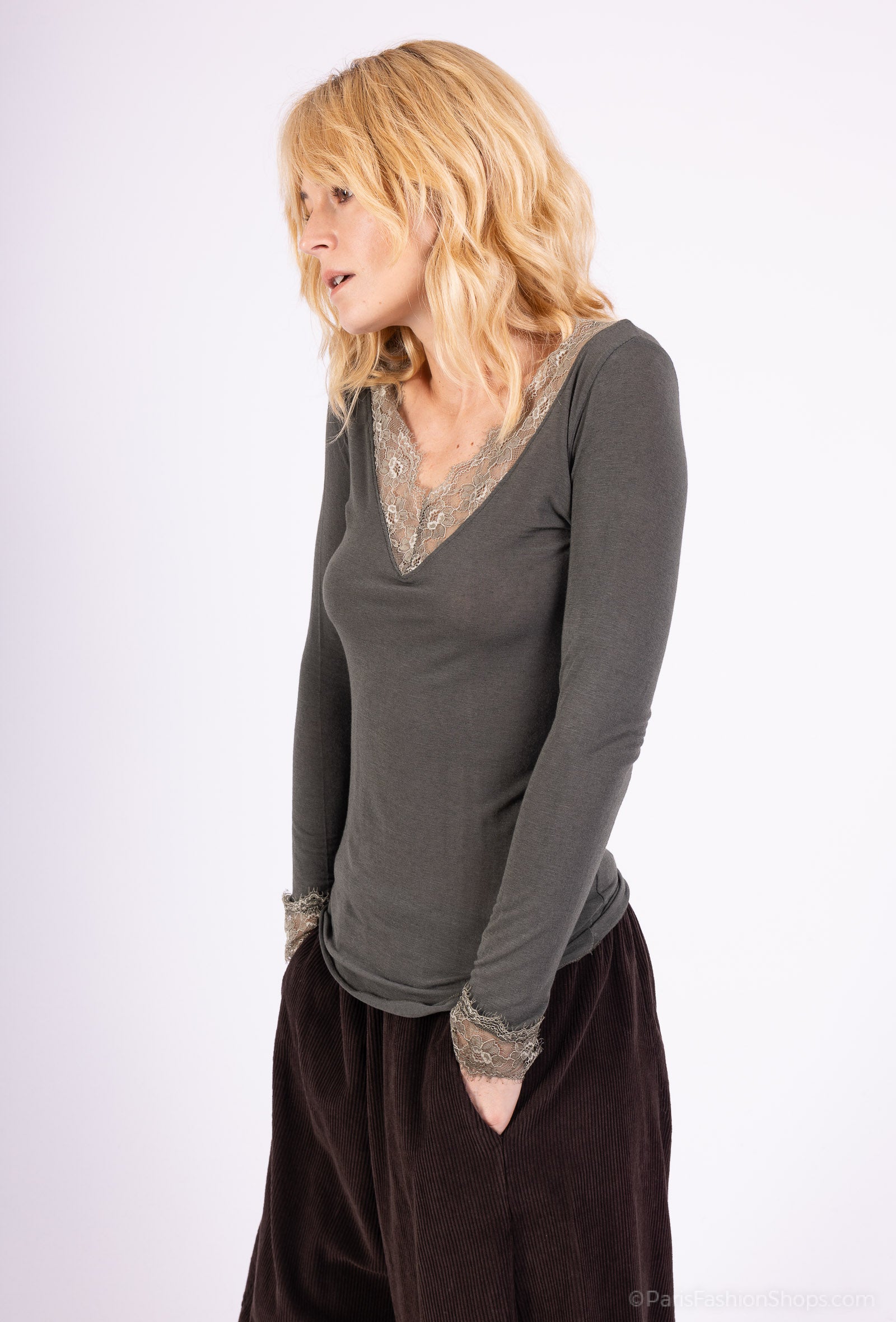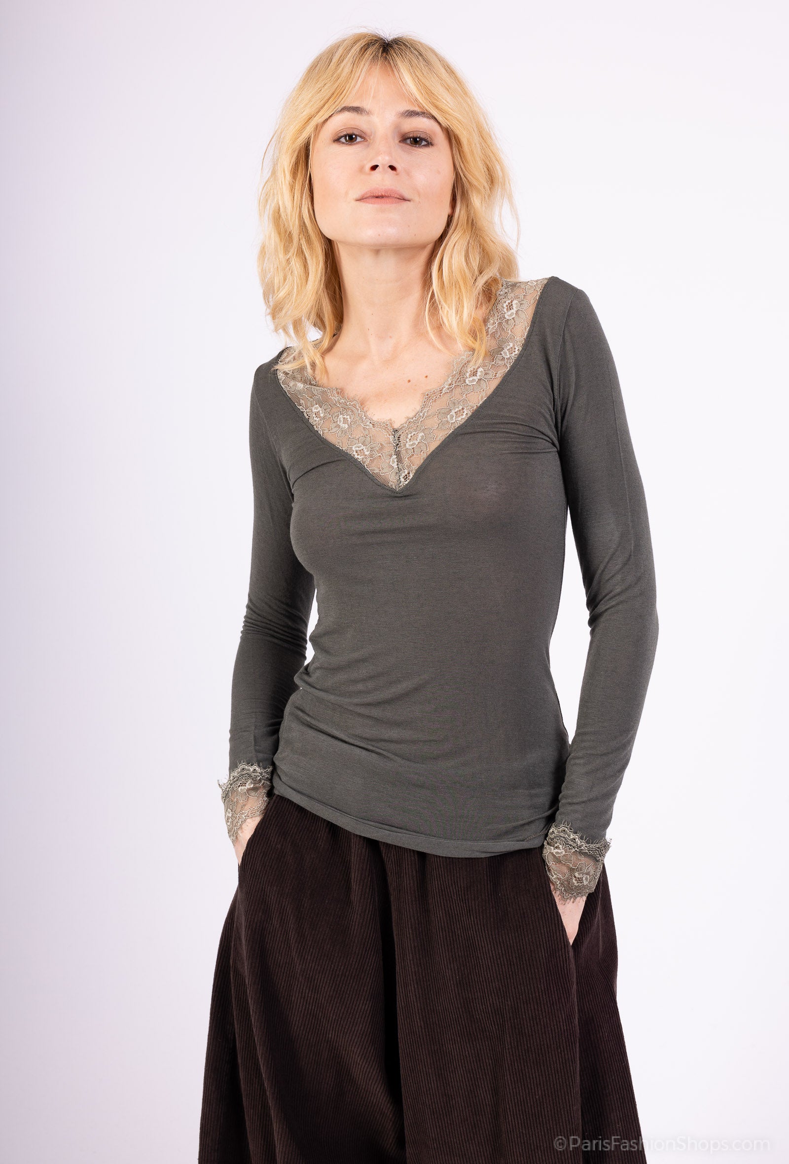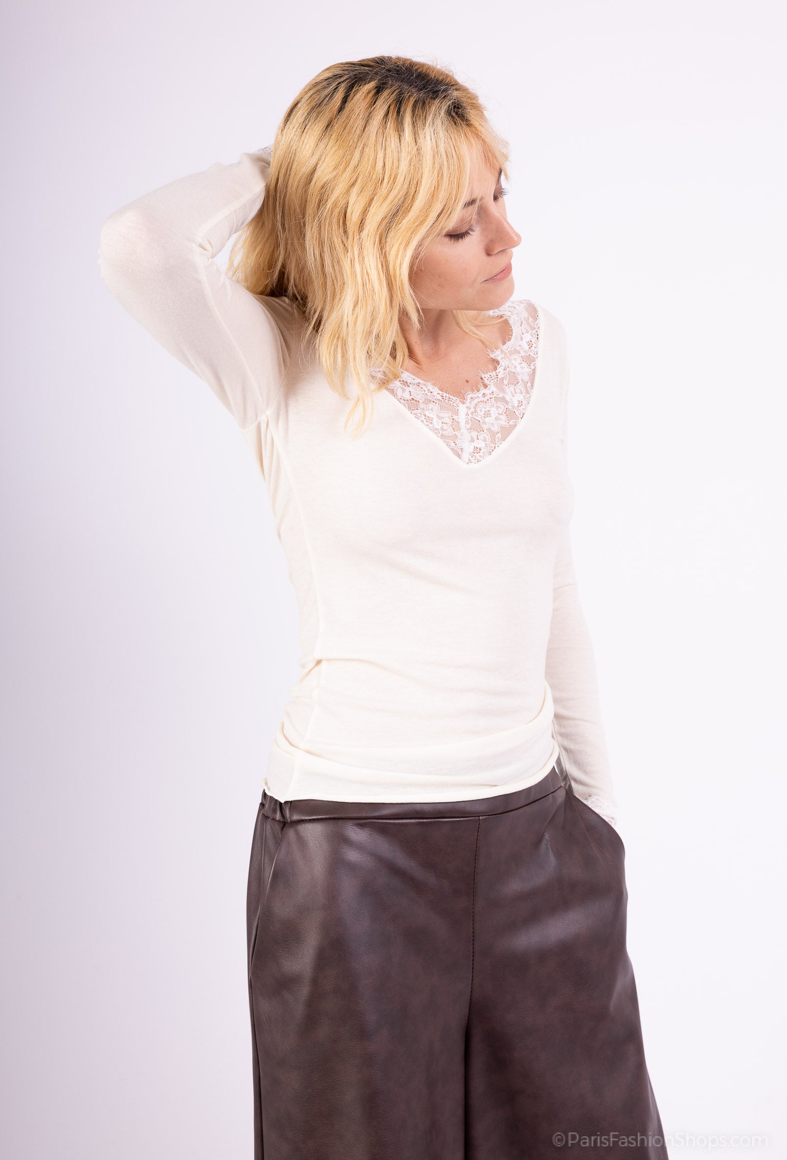 T-Shirt Léger Col V Manches Longue Dentelles 15% Cachemire