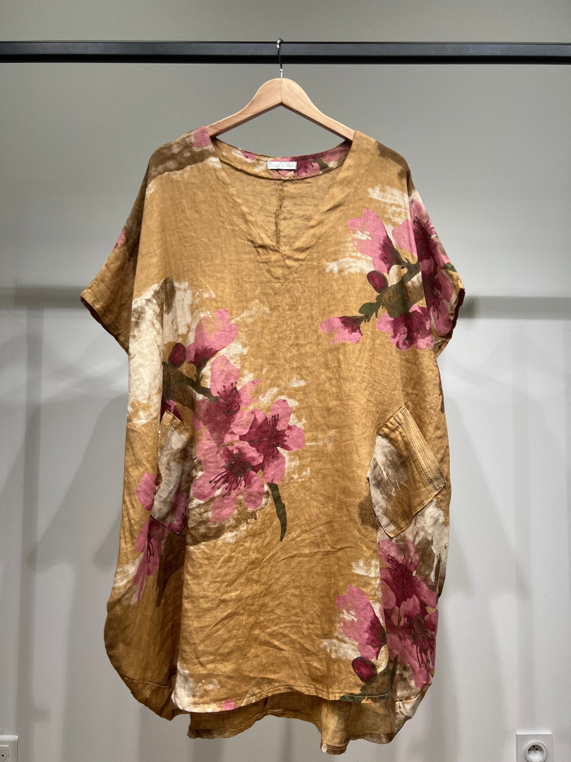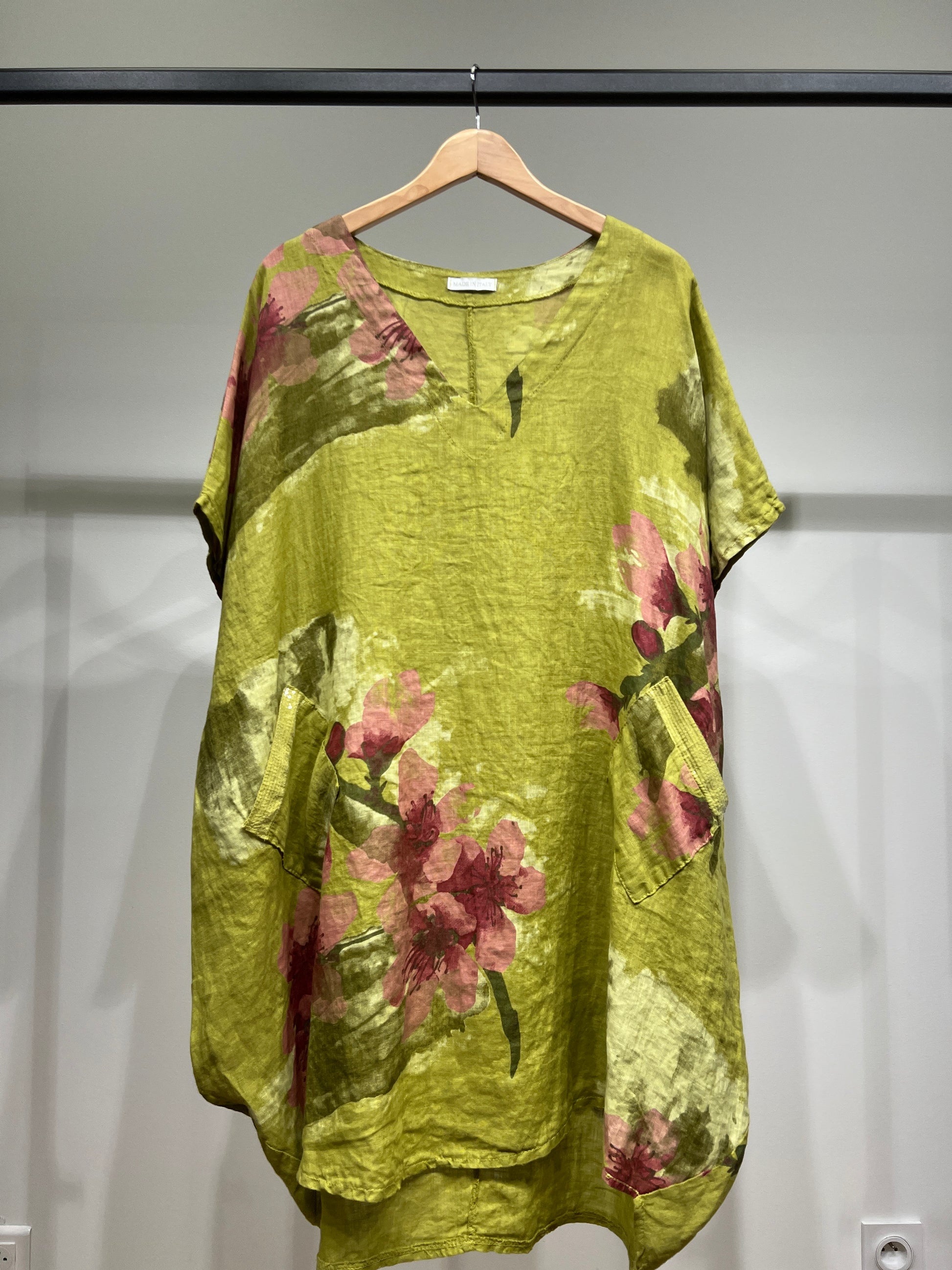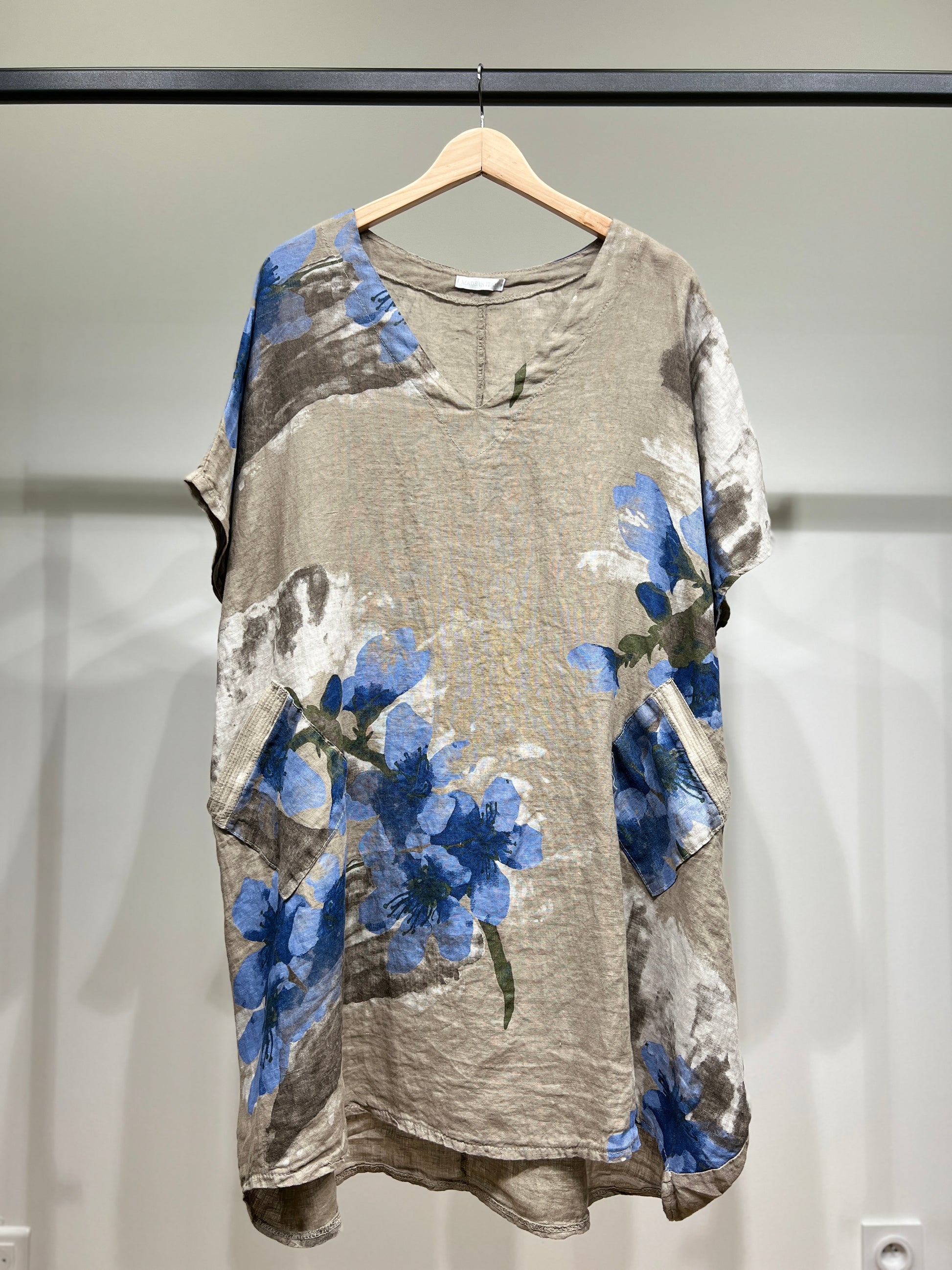 Tunique Large Col V à Poches Sequins Motif Floral 100% Lin