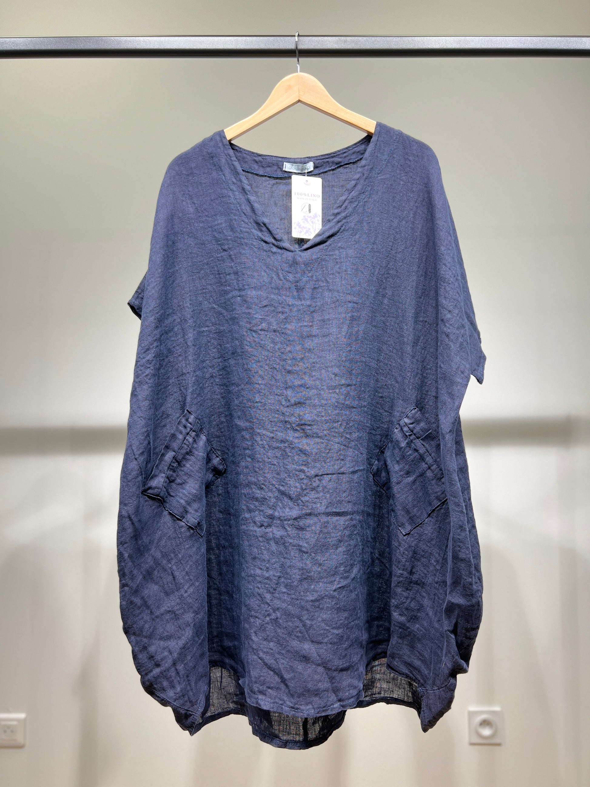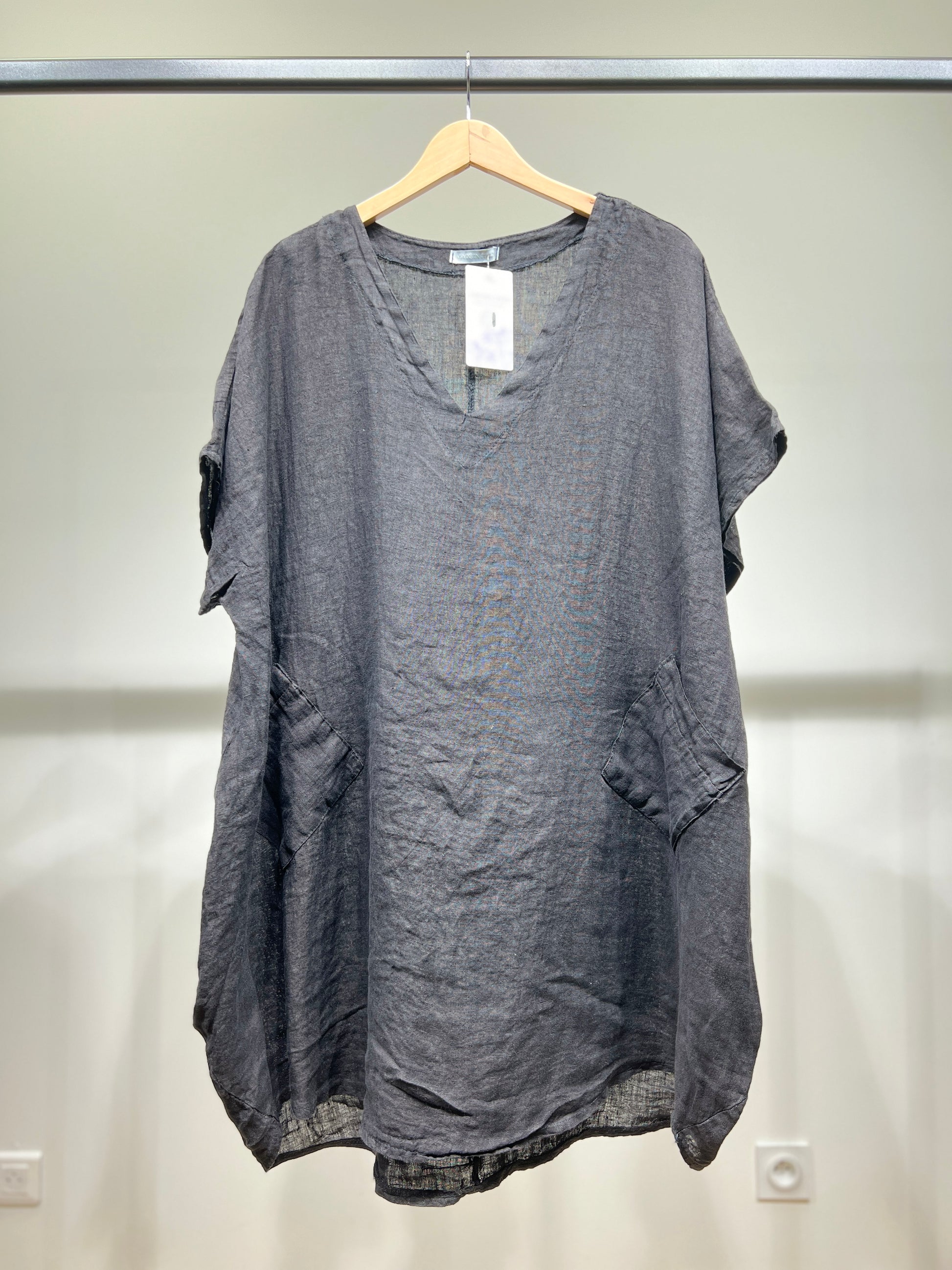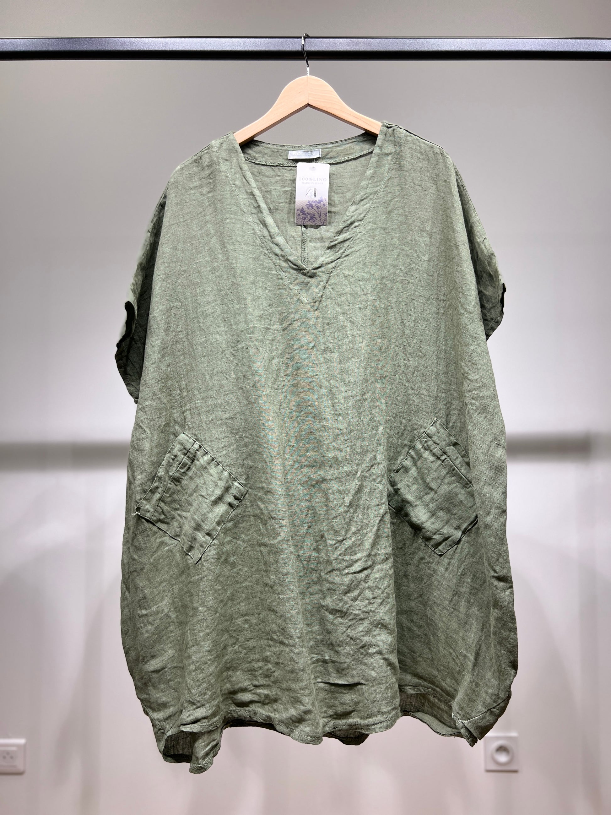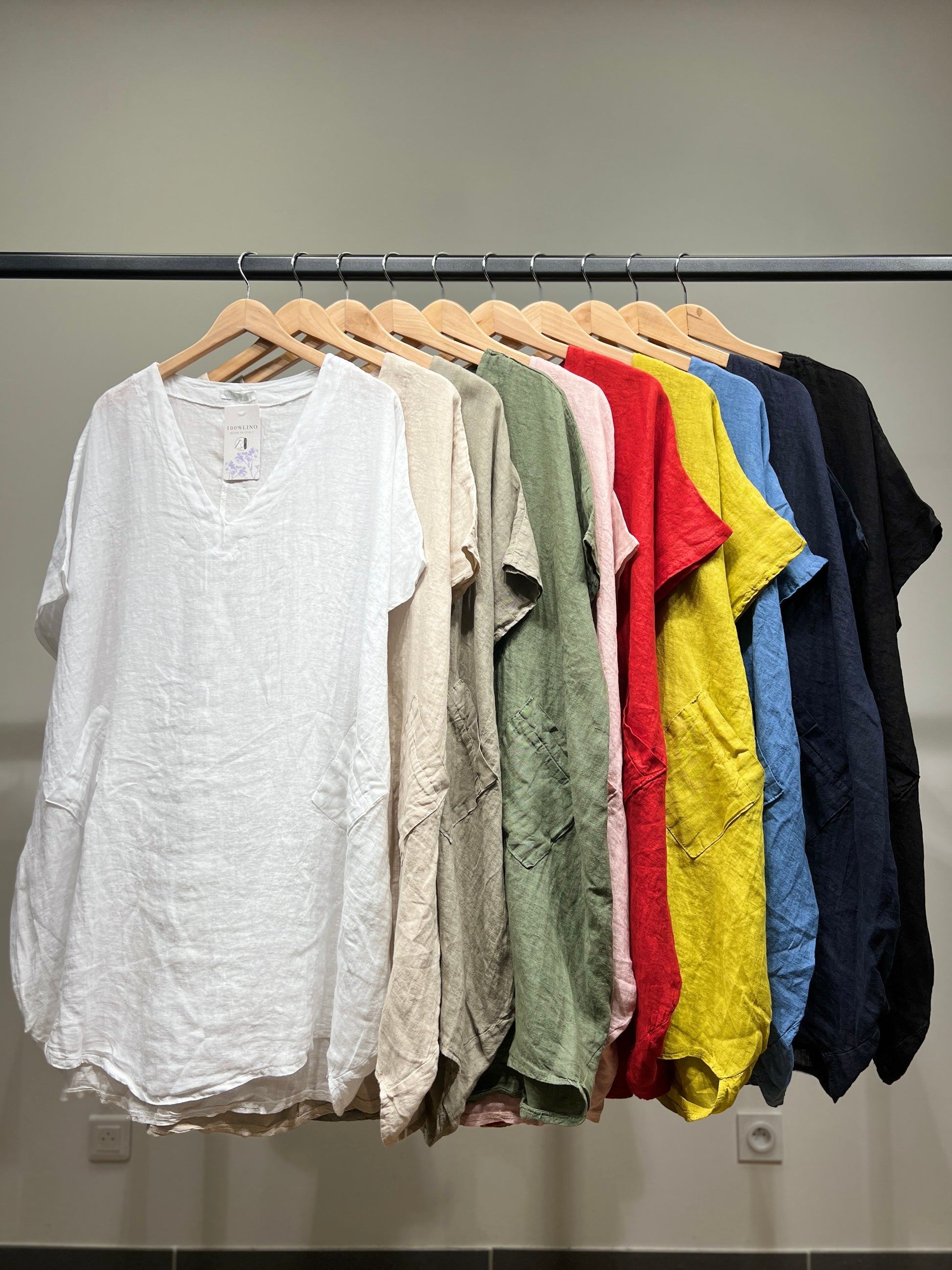 Tunique Large Col V Manche Courte à Poches 100% Lin Taille Unique Convient Aux Tailles 38-48